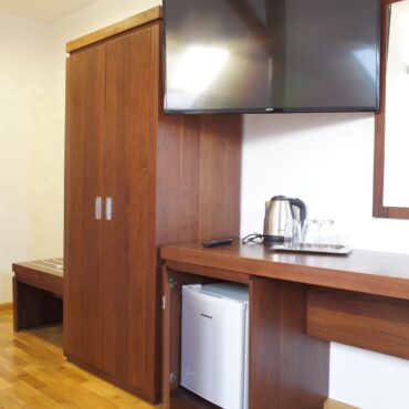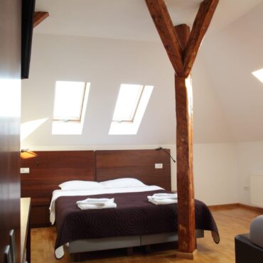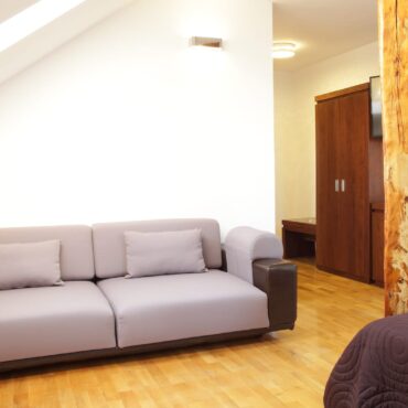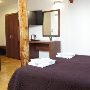 Our triple room is cozy and spacious, suitable for family accommodation. The room is designed in contemporary style, ensuring the relaxation and comfort of our guests. It is furbished with a double bed and a couch, a mini-bar and a coffee machine, TV, Wi-fi access.